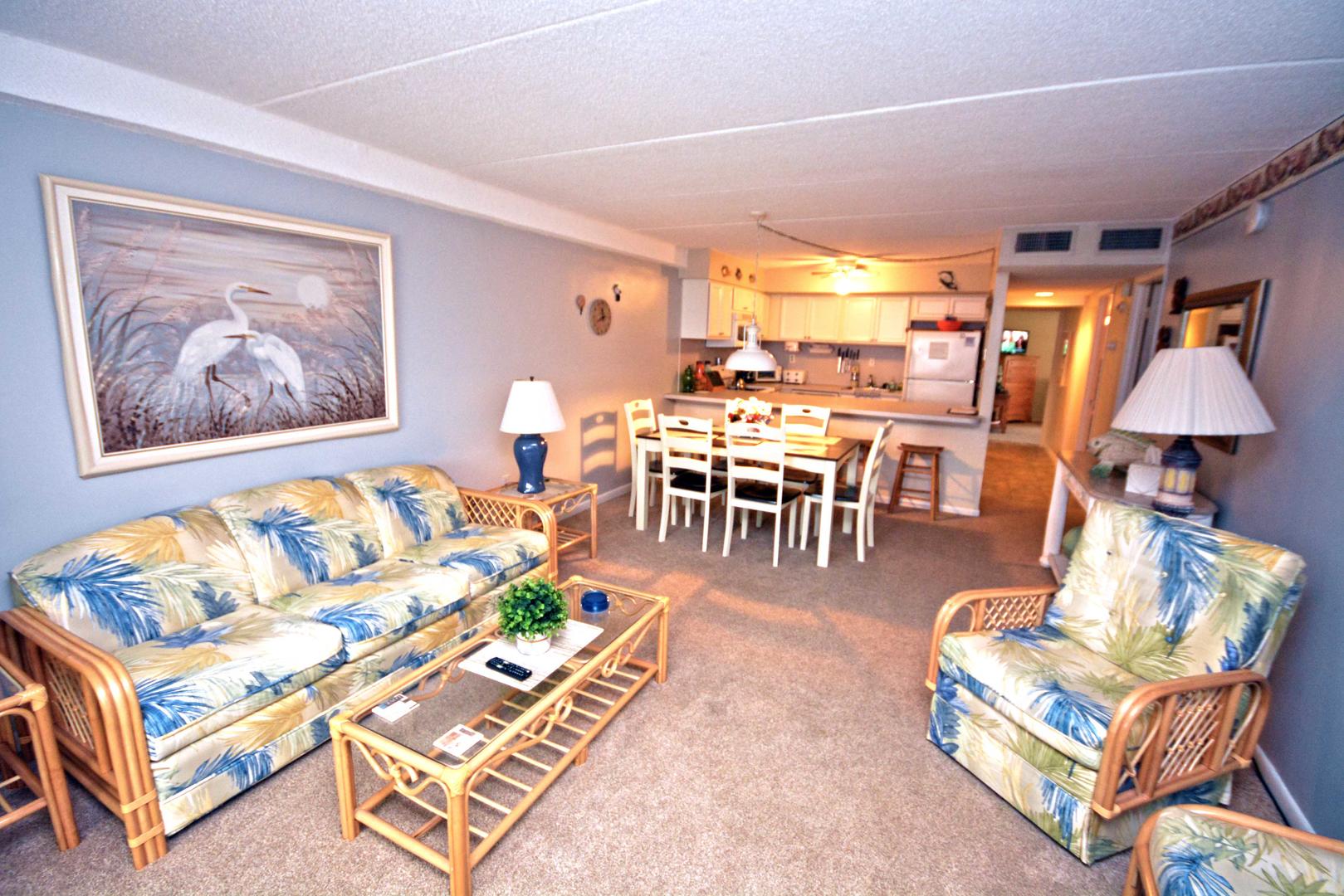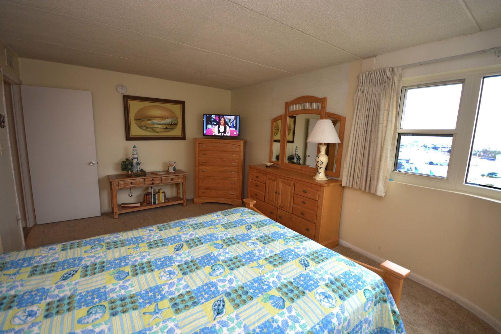 Atlantis 1210 is a quaint, beachfront condominium. This three-bedroom, two and a half-bathroom condo has two furnished, enclosed balconies with a spectacular view of the ocean that you can enjoy in any weather. This unit is the perfect place for you and your family to call home for a week! Atlantis 1210 is one of Ocean City's finest vacation rentals.The beach-themed living room is furnished with two comfortable sofas and a flat-screen television. The couch doubles as a queen-size sleep sofa. The sliding balcony doors allow plenty of natural light to brighten the space. Right off of the living room is a dining area, perfect for enjoying meals with the family. Next to the dining area is the pristine, fully-stocked kitchen with a wide counter top and breakfast bar, perfect for grabbing a quick bite to eat. The master bedroom has a queen-size bed, a television, a balcony and a private bathroom. The second bedroom has a queen-size bed and a television. The third bedroom has a bunk bed, a twin trundle and lots of toys, making it perfect for kids. The second full bathroom and the half-bathroom are located in the hallway. This property comfortably sleeps up to nine people, so bring the whole family!