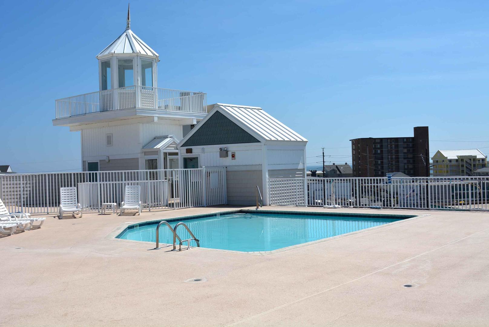 Building Amenities: rooftop outdoor pool, two parking spaces, two elevators, and an outdoor foot shower.