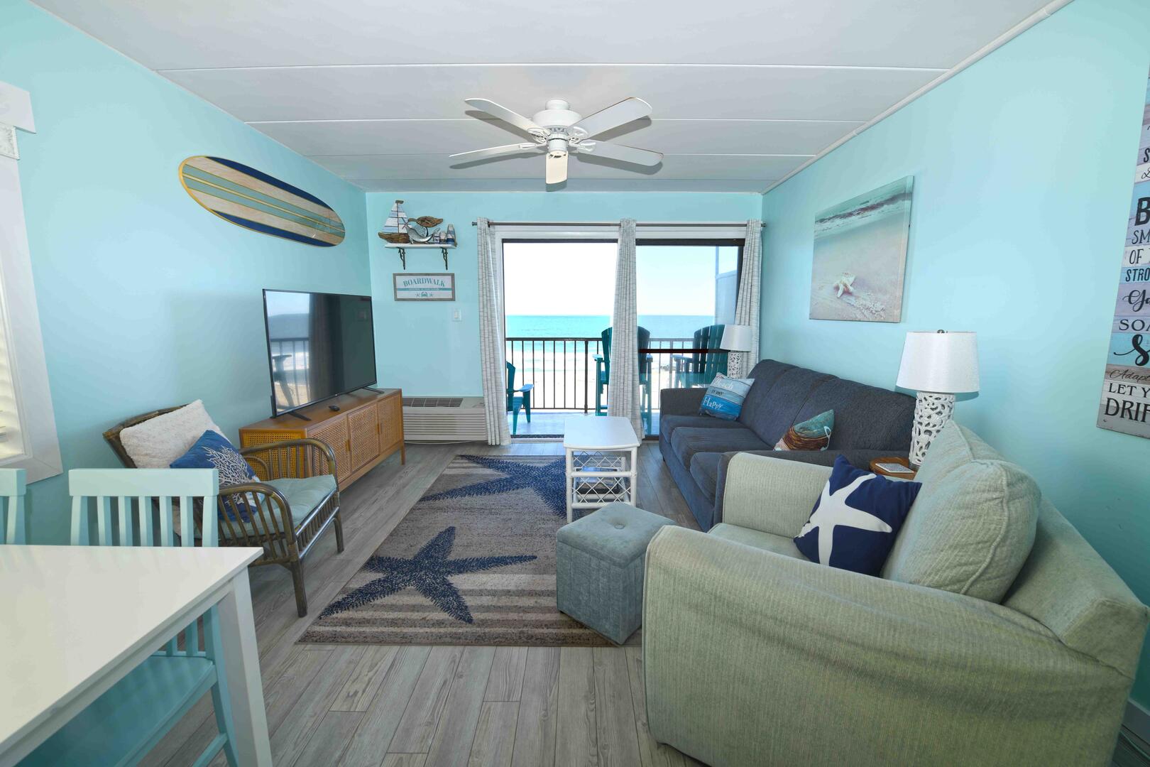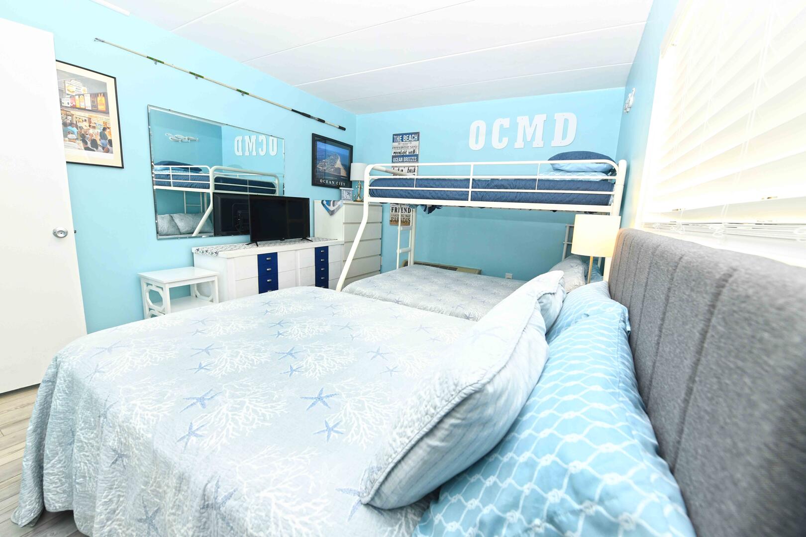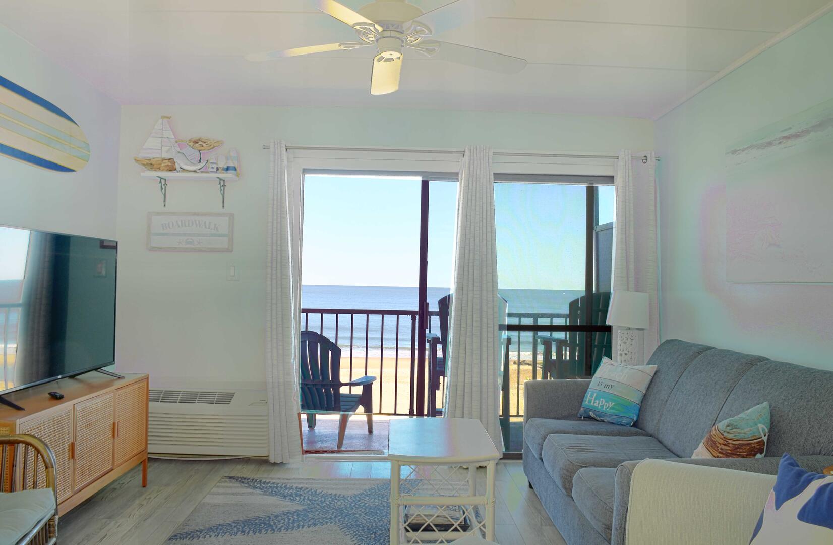Decatur House 410 is a beautiful oceanfront condominium located directly on the Boardwalk. This one-bedroom, one-bathroom condo has a furnished balcony with a stunning ocean view. This unit is the perfect place for you and your family to call home for a week! Decatur House 410 is one of Ocean City's finest vacation rentals.You'll feel like you're on the beach 24/7 with the blue and tan color palette. The living room is furnished with a comfortable sofa, an arm chair, two indoor lounge chairs and a flat-screen TV. The couch doubles as a double sleep sofa. The sliding balcony doors bathe the space in natural light. Right off of the living room is a dining area, perfect for enjoying meals with the family. Next to the dining area is the fully-stocked kitchen, essential for cooking gourmet meals. The bedroom has a double bed, a pyramid bunk bed and a flat-screen TV. The full bathroom is located in the hallway. This property comfortably sleeps up to six people, so bring the whole family!