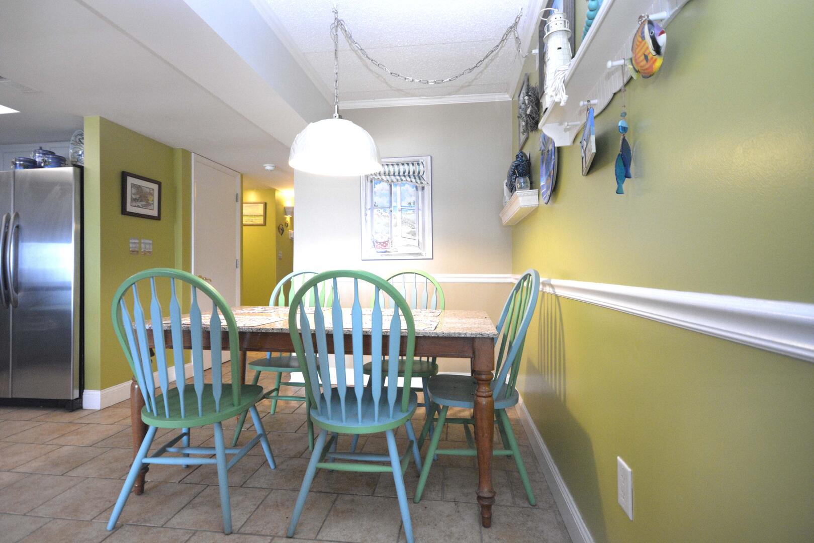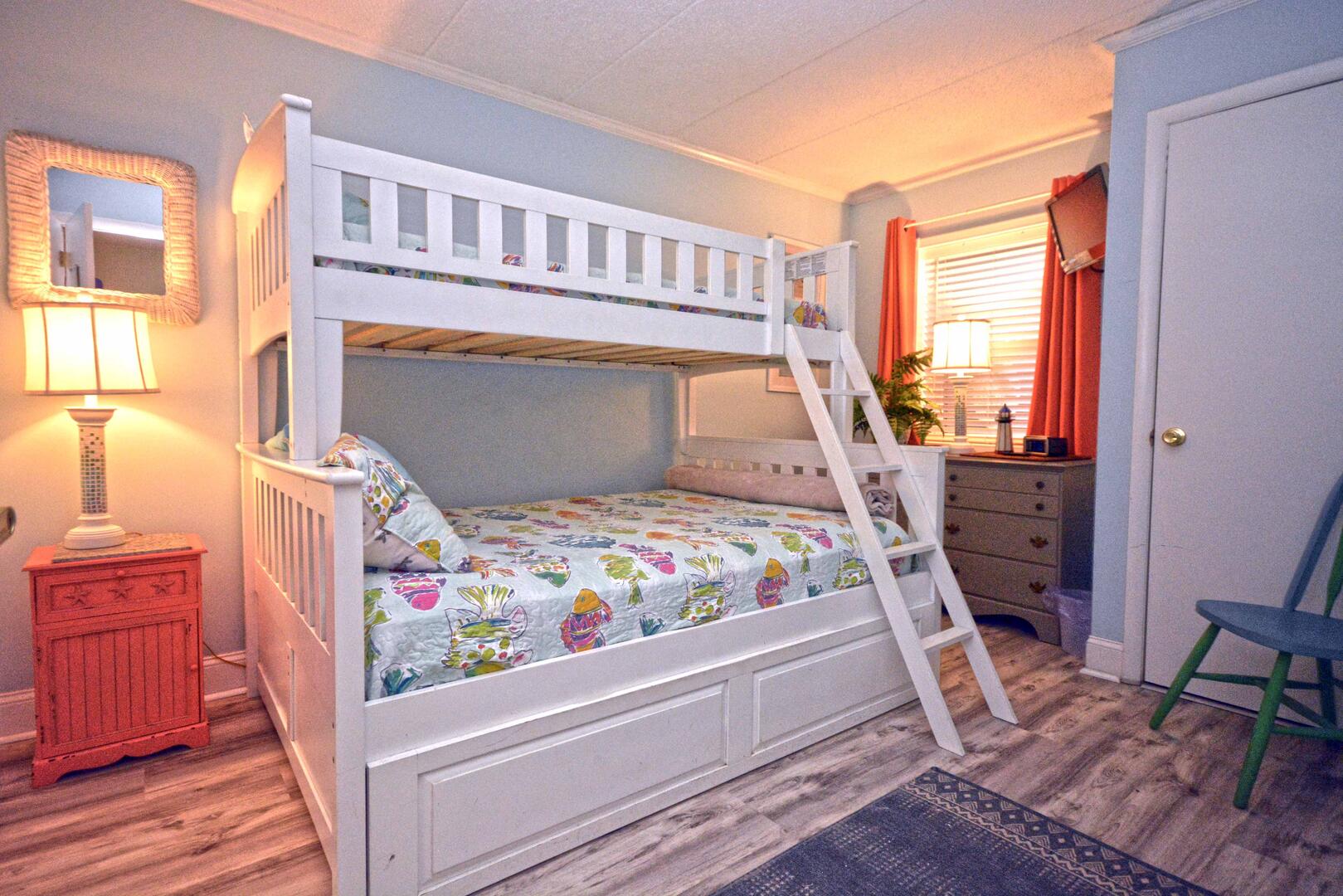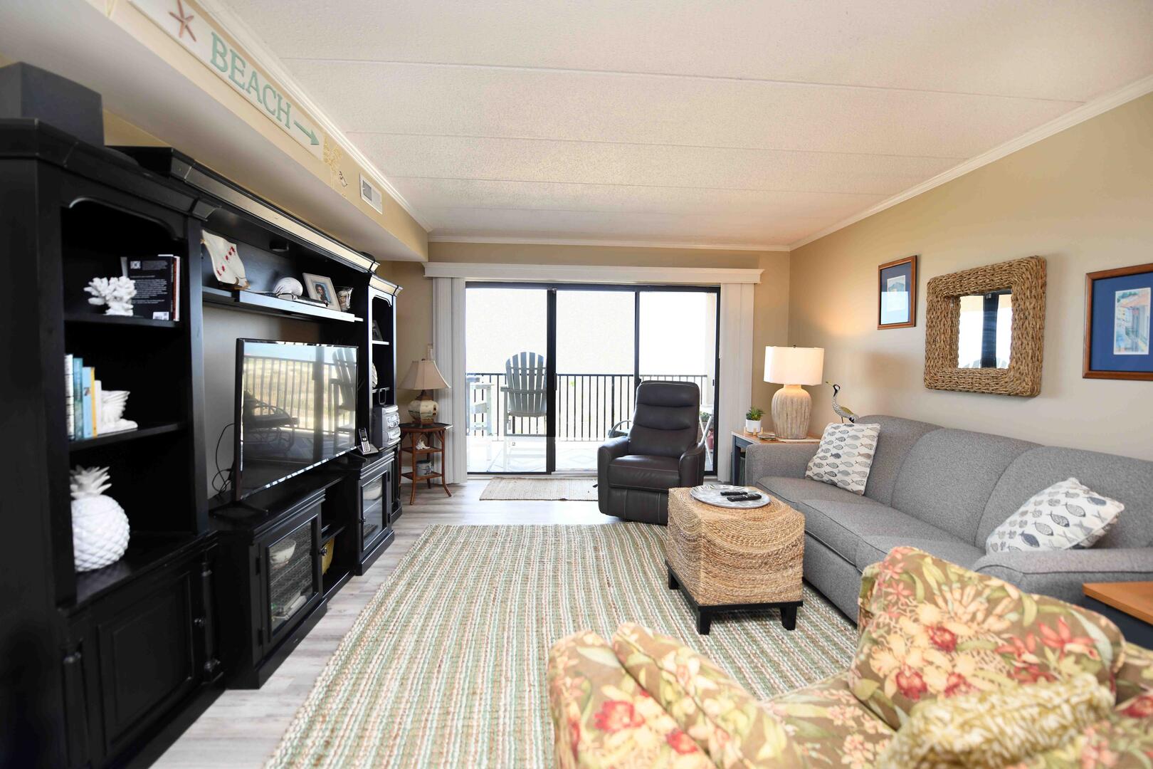 Misty Sea 102 is a luxury beachfront condominium with renovated bathrooms. This two-bedroom, two bathroom condo has a furnished balcony with an amazing view of the ocean. This unit is the perfect place for you and your family to call home for a week! Misty Sea 102 is one of Ocean City's finest vacation rentals.The beach-themed living room is furnished with a comfortable sofa, a recliner, a floral armchair and a television. The couch doubles as a queen-size sleep sofa. The sliding balcony doors allow plenty of natural light to brighten the space. Right off the living room is a dining area with seating for 6 people. Next to the dining area is the fully-stocked recently updated kitchen with new stainless steel appliances and a wide, granite counter top & breakfast bar. The master bedroom has a queen-size bed, a television and a private bathroom. The second bedroom has a pyramid bunk bed and a television. The second bathroom is located in the hallway. This property comfortably sleeps up to seven people, so bring the whole family!