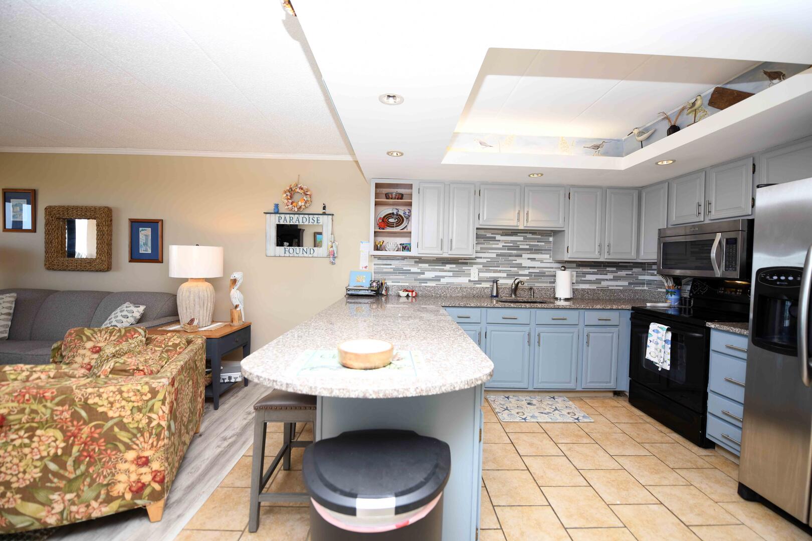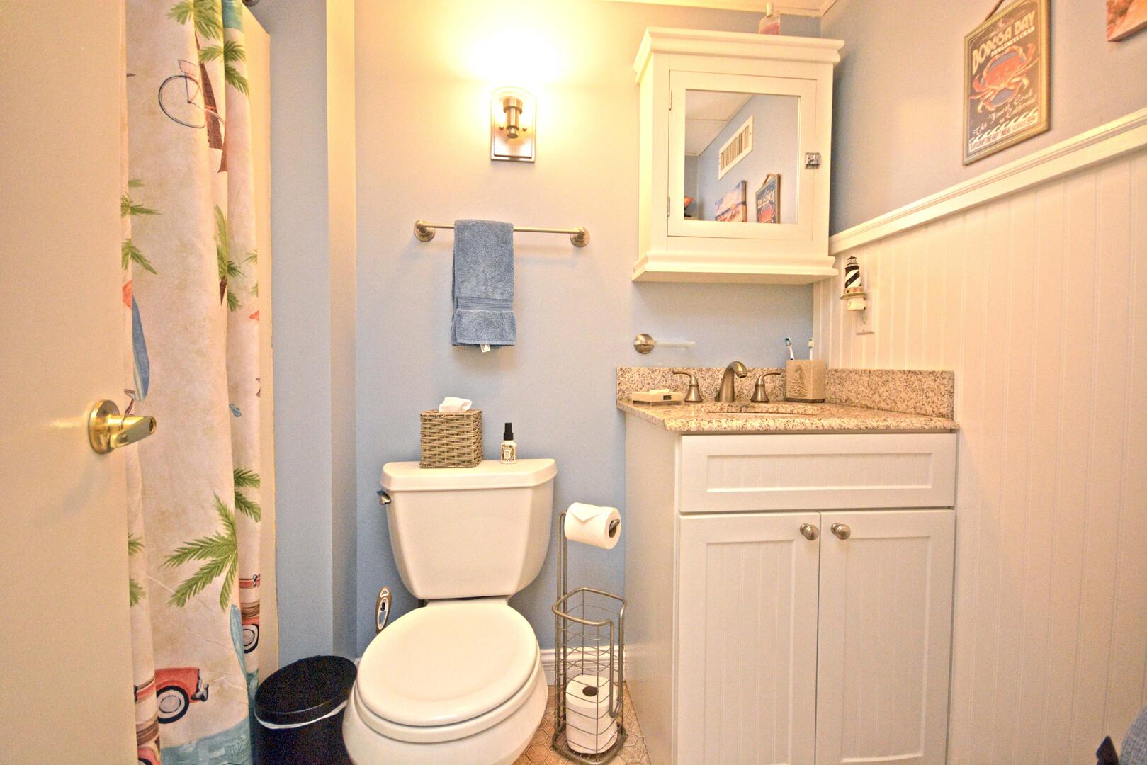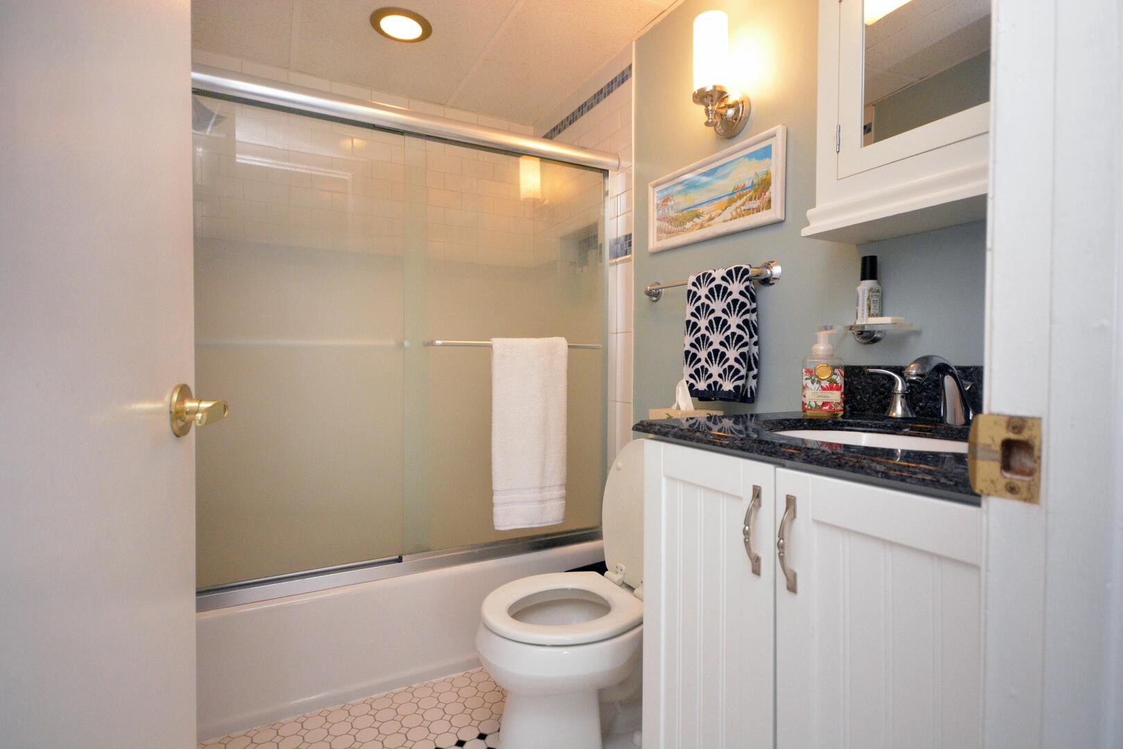 Misty Sea 102 is a luxury beachfront condominium with renovated bathrooms. This two-bedroom, two bathroom condo has a furnished balcony with an amazing view of the ocean. This unit is the perfect place for you and your family to call home for a week! Misty Sea 102 is one of Ocean City's finest vacation rentals.The beach-themed living room is furnished with a comfortable sofa, a recliner, a floral armchair and a television. The couch doubles as a queen-size sleep sofa. The sliding balcony doors allow plenty of natural light to brighten the space. Right off the living room is a dining area with seating for 6 people. Next to the dining area is the fully-stocked recently updated kitchen with new stainless steel appliances and a wide, granite counter top & breakfast bar. The master bedroom has a queen-size bed, a television and a private bathroom. The second bedroom has a pyramid bunk bed and a television. The second bathroom is located in the hallway. This property comfortably sleeps up to seven people, so bring the whole family!