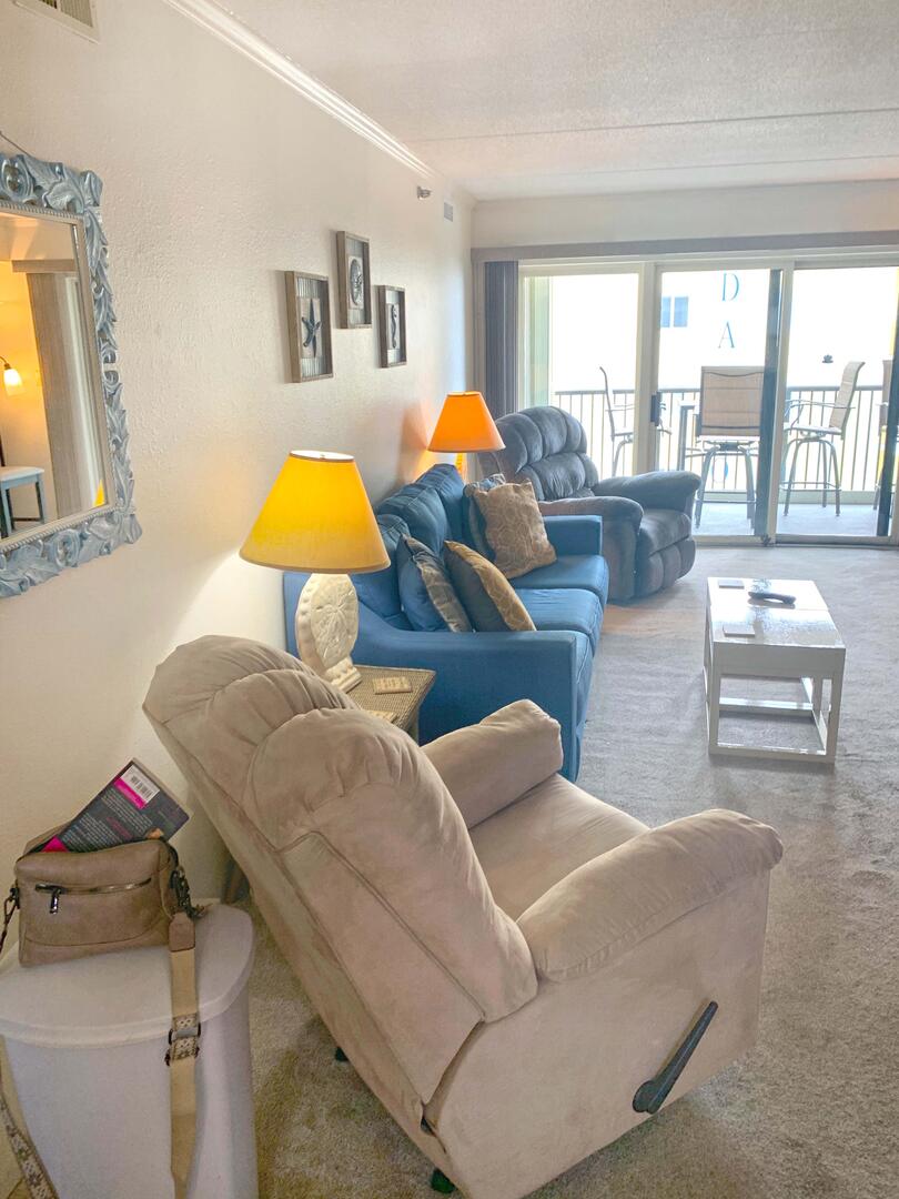 Sandpiper Dunes 412 is one of Ocean City's finest vacation rentals. Oceanfront building with a North side view of the ocean. The living room is furnished with a sofa, loveseat and a flat-screen television with DVD/VHS option and a soundbar and a Bluetooth connection. The couch doubles as a queen-size sleep sofa. The sliding balcony doors allows plenty of natural light to brighten the space. Right off of the living room is a dining area, perfect for delicious meals with the family. Next to the dining area is the fully stocked kitchen with a breakfast bar, and a Keurig coffee maker, is just right for grabbing a quick bite. The balcony allows you to catch a view of the ocean or bay any time of day or night. The master bedroom has a King bed and a private bathroom with a wall mounted flat screen TV. The second bedroom has two double beds and a TV. The second bathroom is located in the hallway. This property comfortably sleeps up to eight people, so bring the whole family!Bed sizes:
