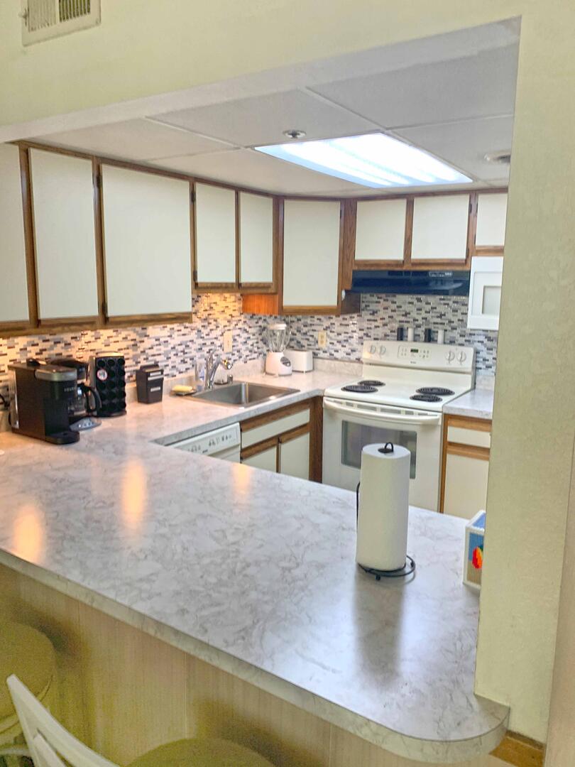 Sandpiper Dunes 412 has the following amenities: central air conditioning, outdoor pool, two parking spaces, three TV's , DVD/VCR combo, sound bar, free WiFi, cable TV, full-size washer and dryer, refrigerator, microwave, Keurig, toaster, stove, disposal, dishwasher, and an outdoor foot shower.