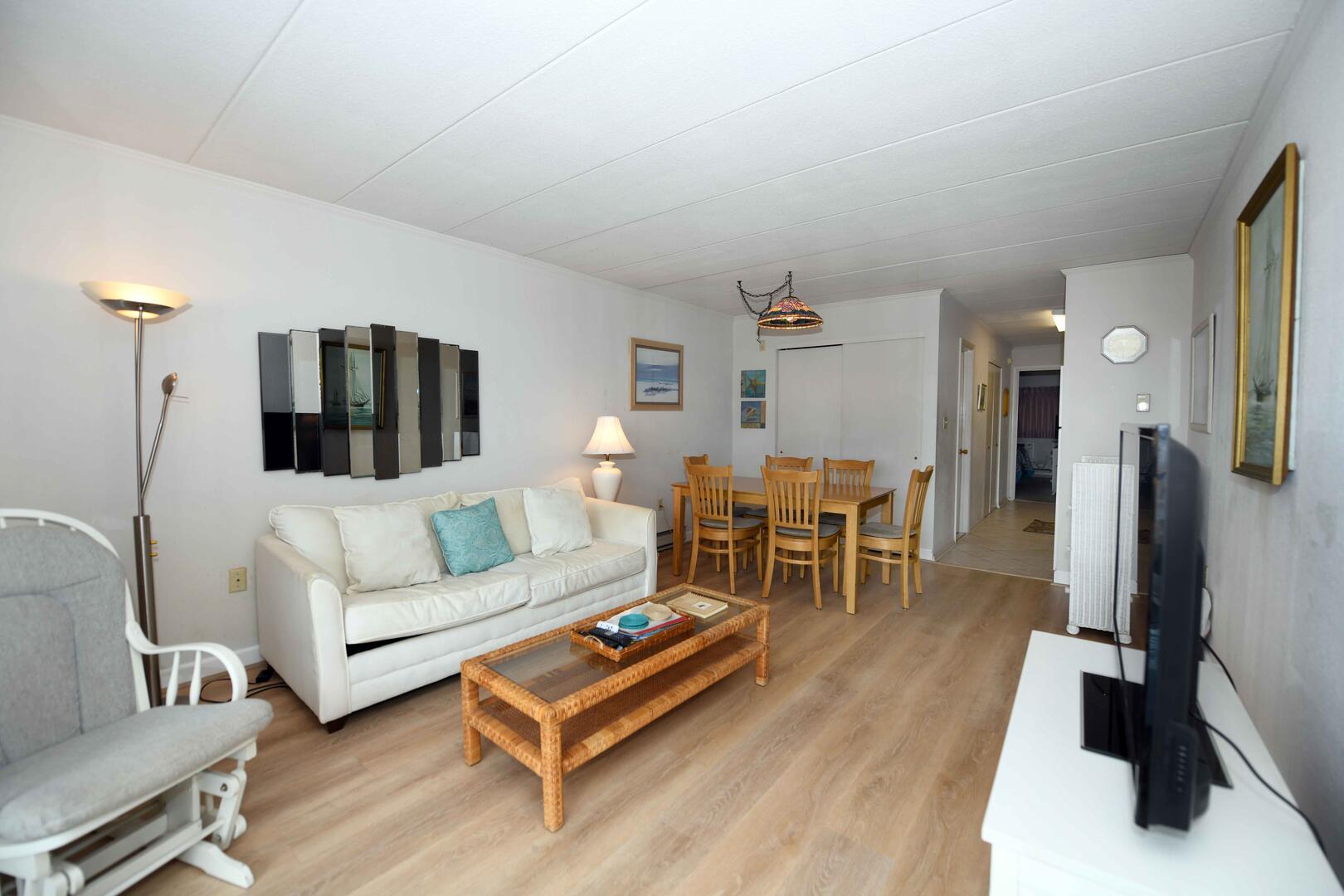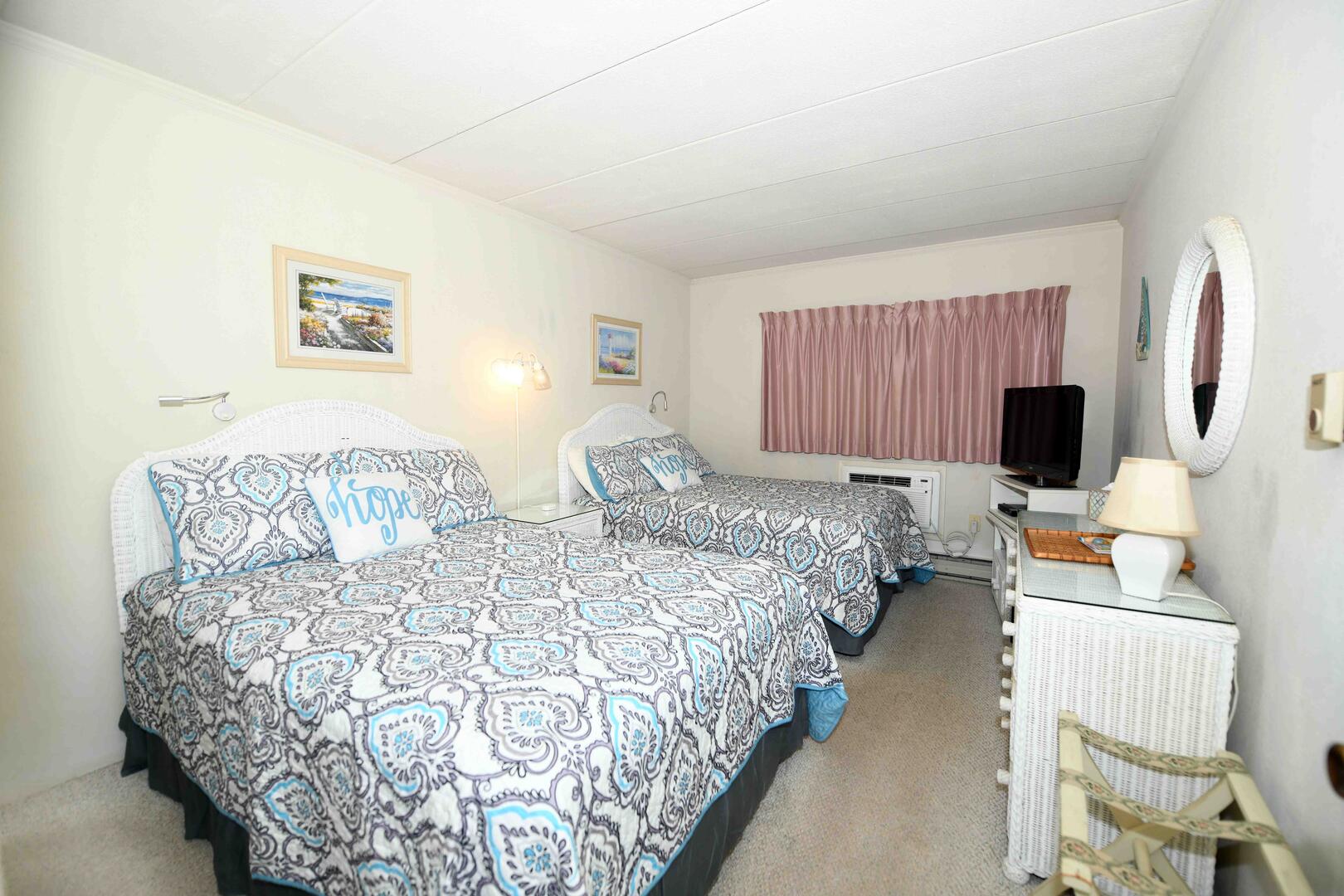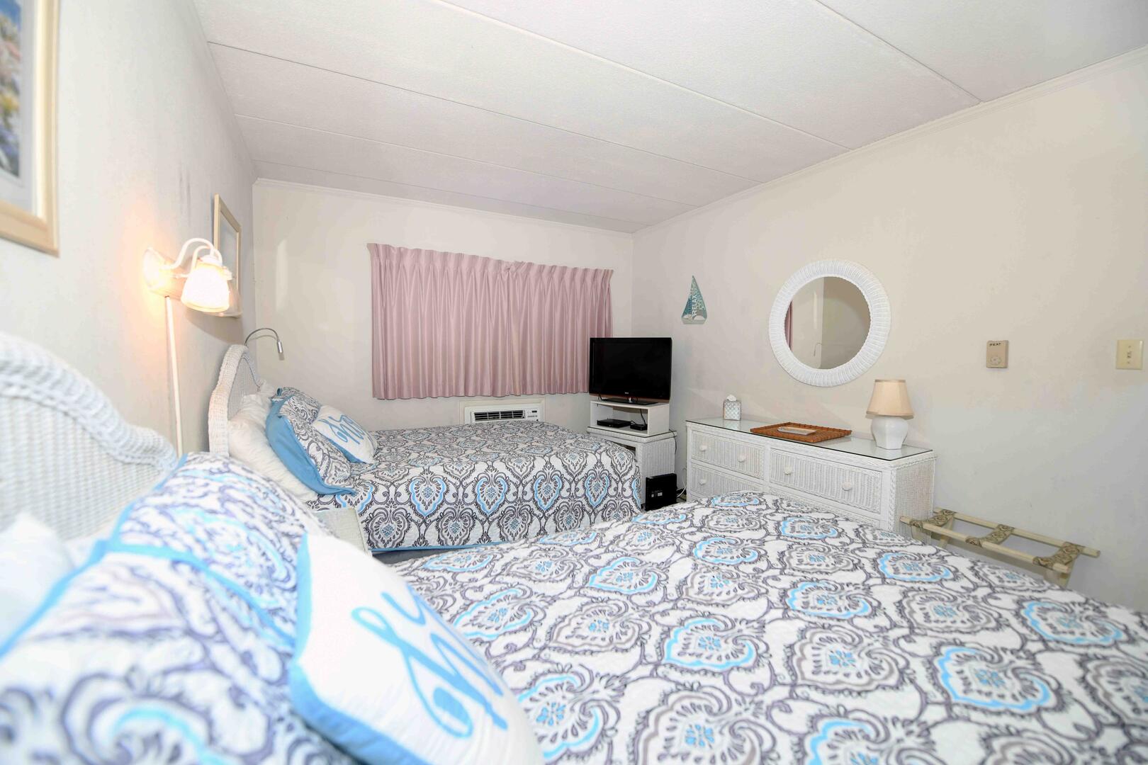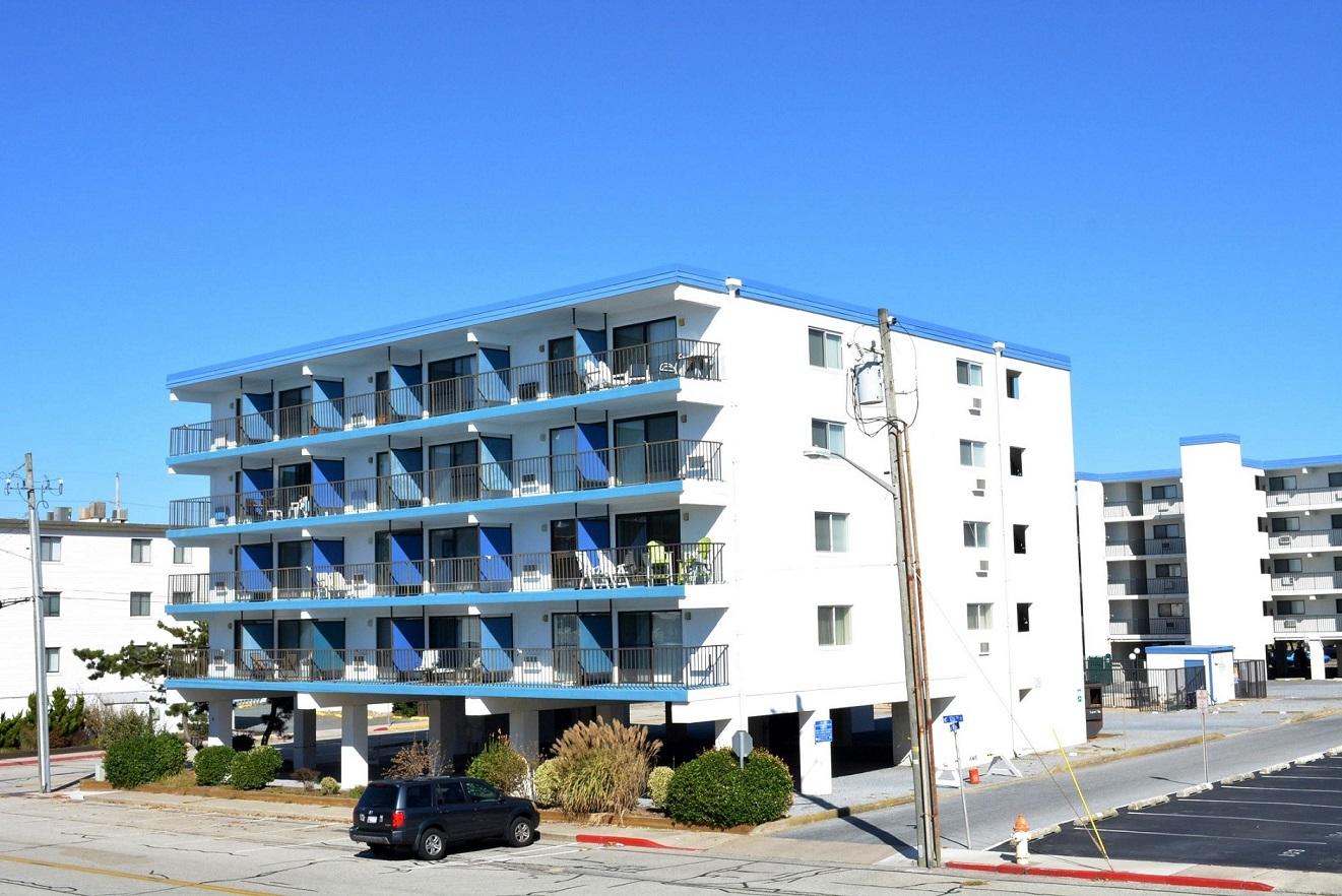 Top Royal 403-S is a condominium located on the ocean block. This one-bedroom, one and a half bathroom condo has a furnished balcony with a spectacular view of a peaceful, family-friendly neighborhood and the ocean. This unit is the perfect place for you and your family to call home for a week!The minimalist living room is furnished with a floral couch, a comfortable arm chair, and a television. The couch doubles as a queen-size sleep sofa. The sliding balcony doors allow plenty of natural light to brighten the space. Right off the living room is a small dining area, perfect for meals with the family. Bridging the gap between the living room and the bedroom is the fully-stocked kitchen. The bedroom has two double beds, a television, and a private half-bathroom. The full bathroom is located in the hallway. This property comfortably sleeps up to six people, so bring the whole family!