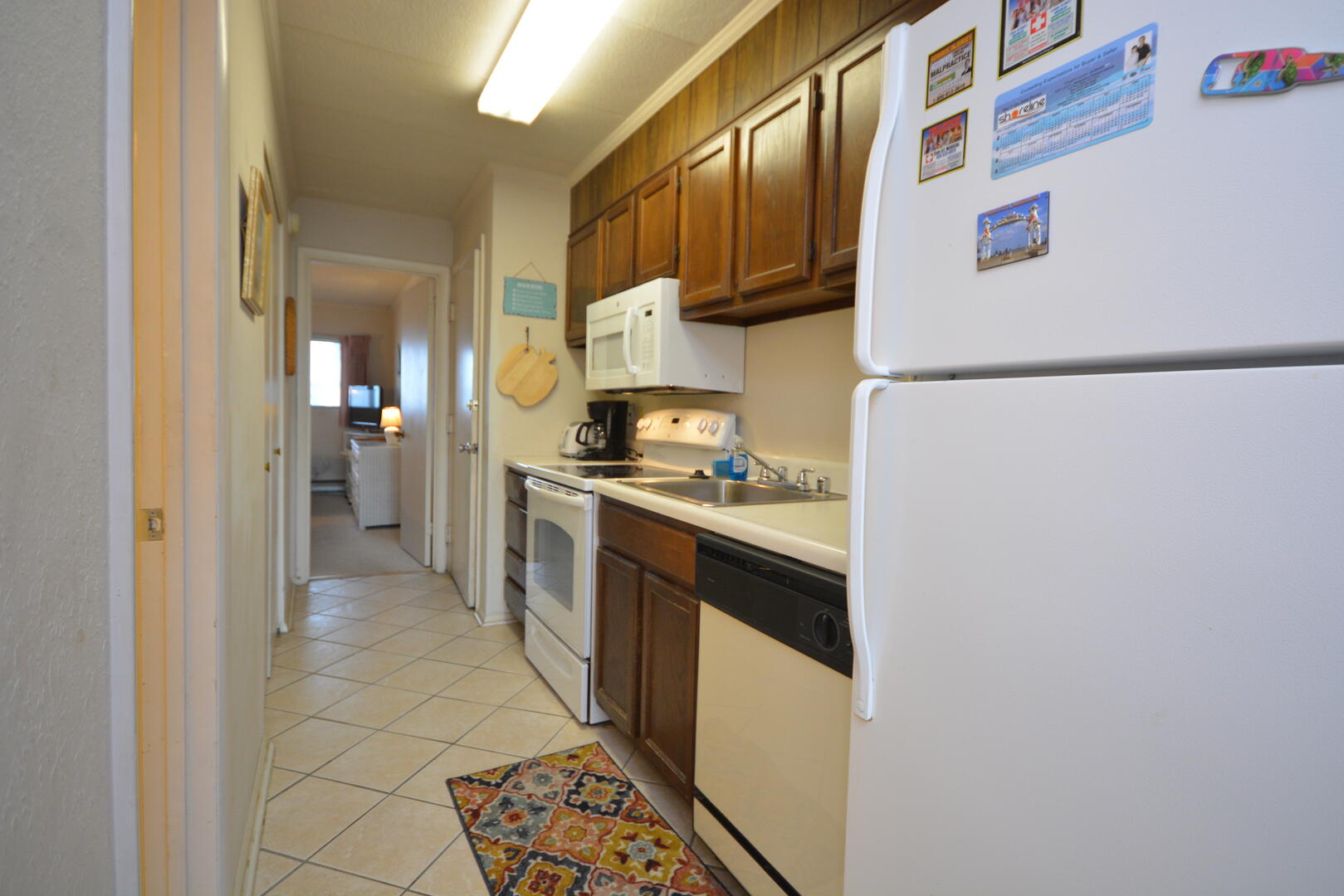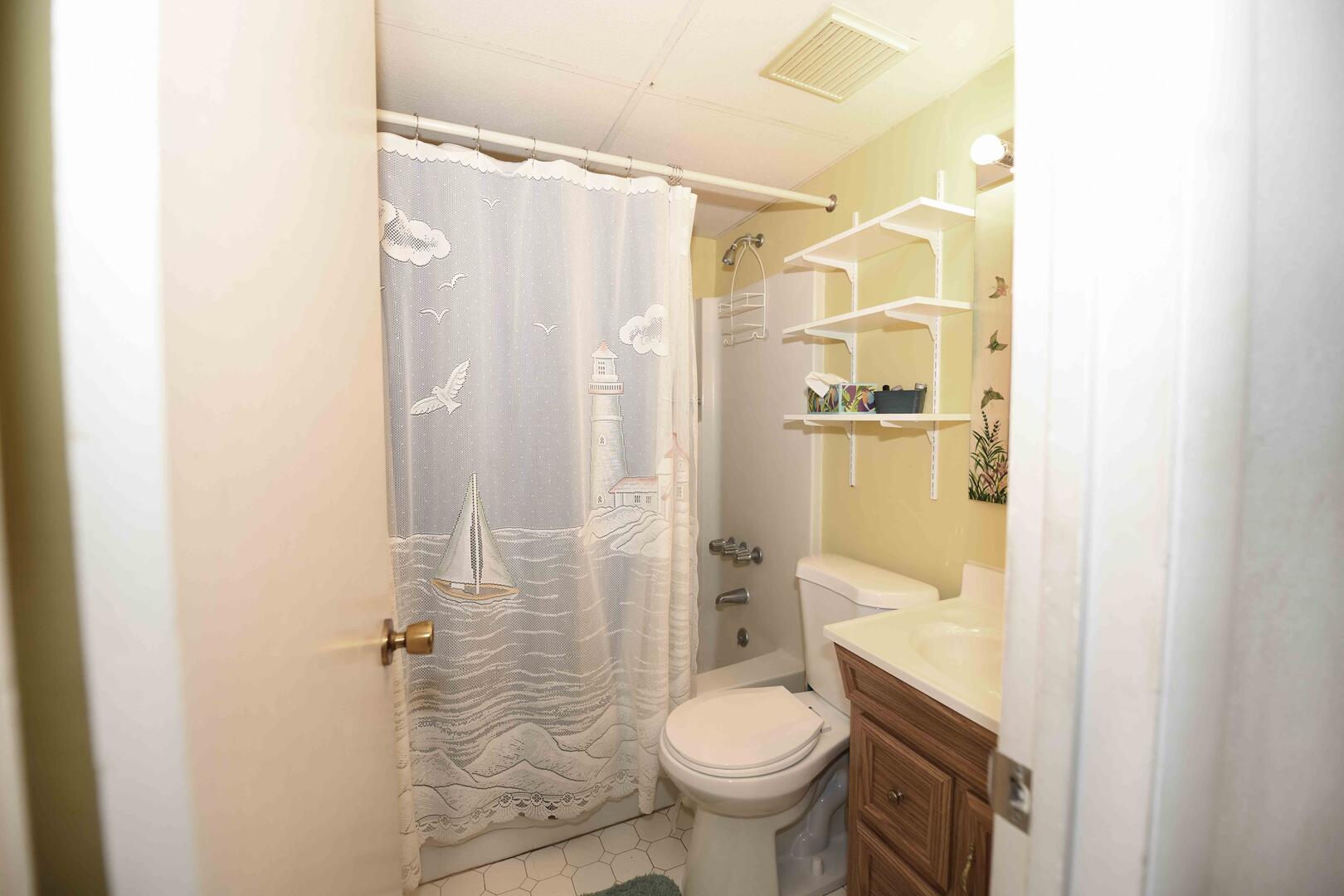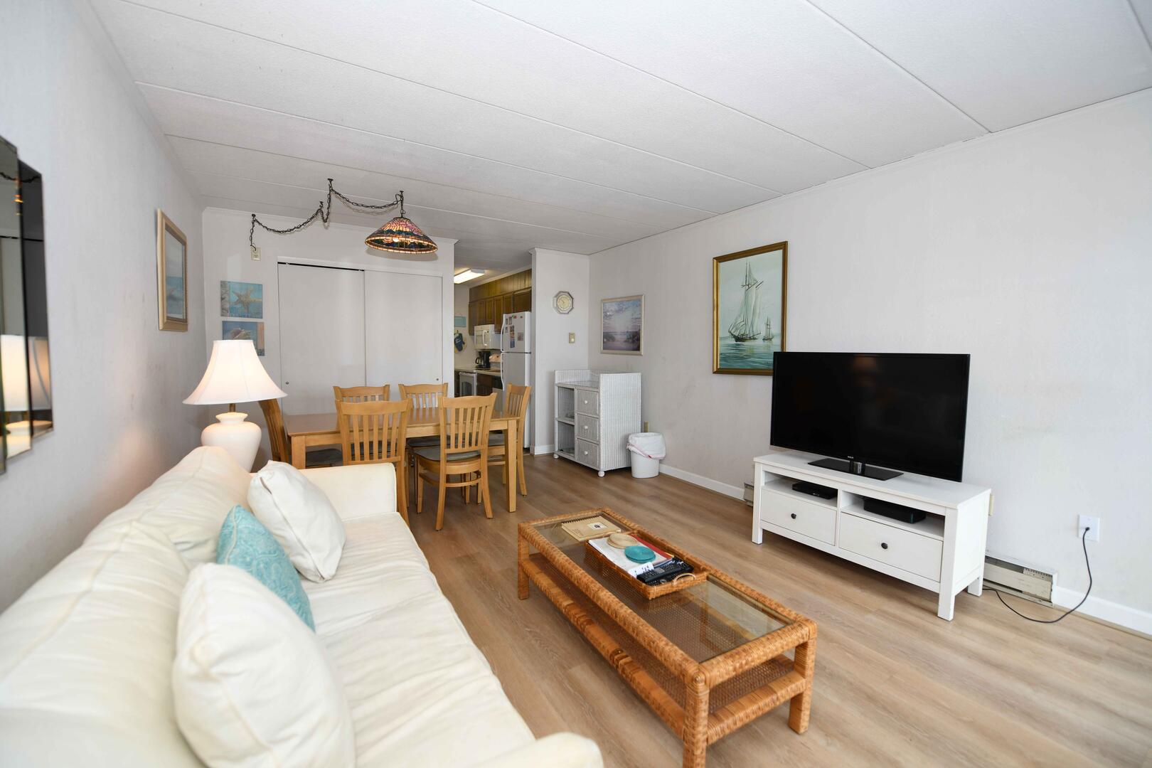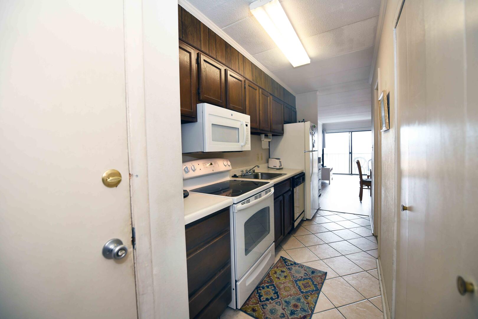 Top Royal 403-S is a condominium located on the ocean block. This one-bedroom, one and a half bathroom condo has a furnished balcony with a spectacular view of a peaceful, family-friendly neighborhood and the ocean. This unit is the perfect place for you and your family to call home for a week!The minimalist living room is furnished with a floral couch, a comfortable arm chair, and a television. The couch doubles as a queen-size sleep sofa. The sliding balcony doors allow plenty of natural light to brighten the space. Right off the living room is a small dining area, perfect for meals with the family. Bridging the gap between the living room and the bedroom is the fully-stocked kitchen. The bedroom has two double beds, a television, and a private half-bathroom. The full bathroom is located in the hallway. This property comfortably sleeps up to six people, so bring the whole family!